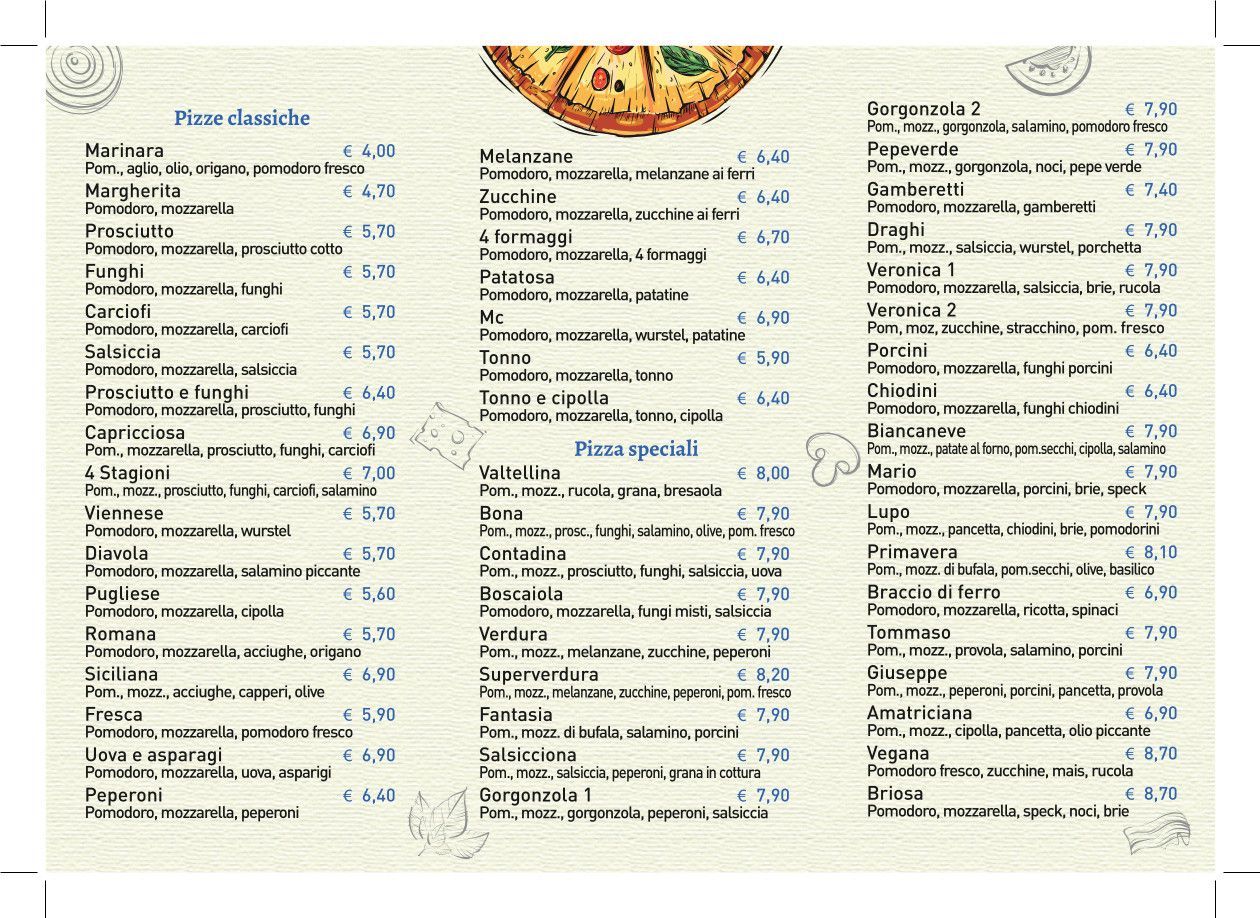 Siamo aperti tutti i giorni, a pranzo dalle ore 12:00 alle ore 14:00 e a cena dalle ore 18:00 alle ore 22:00, con un servizio completo che comprende la consumazione ai tavoli con sistemazione esterna durante la bella stagione, pizza da asporto e consegna.